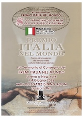 la XX Edizione del PREMIO ITALIA NEL MONDO si terrA' a New York nella DELEGATES DINING ROOM - SOUTH DINING ROOM presso le NAZIONI UNITE in omaggio alla universalitA' della cultura Italiana